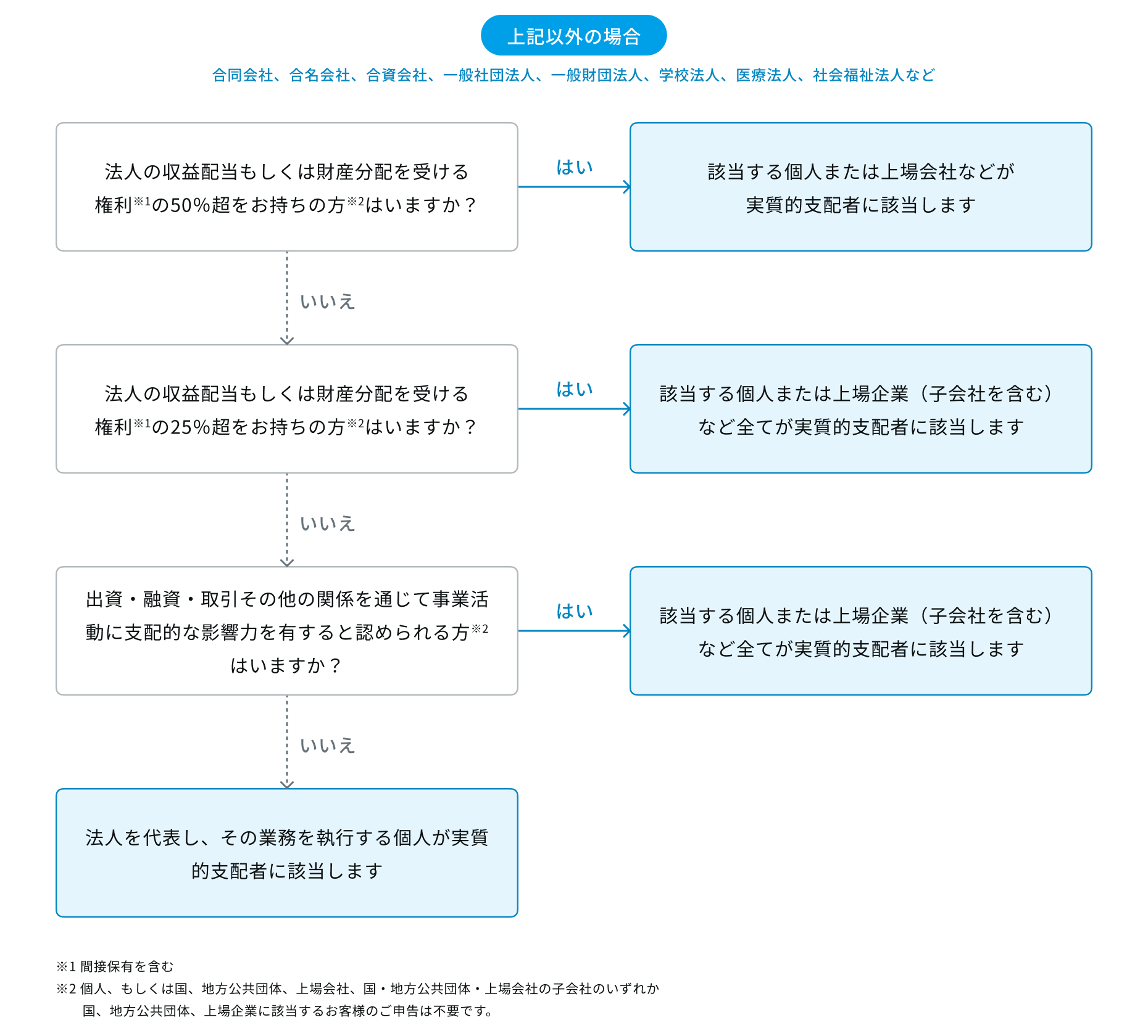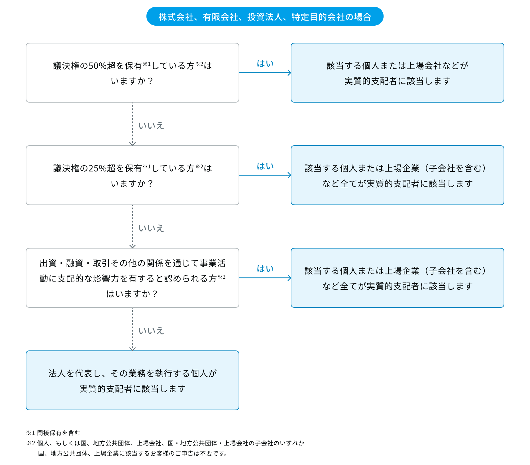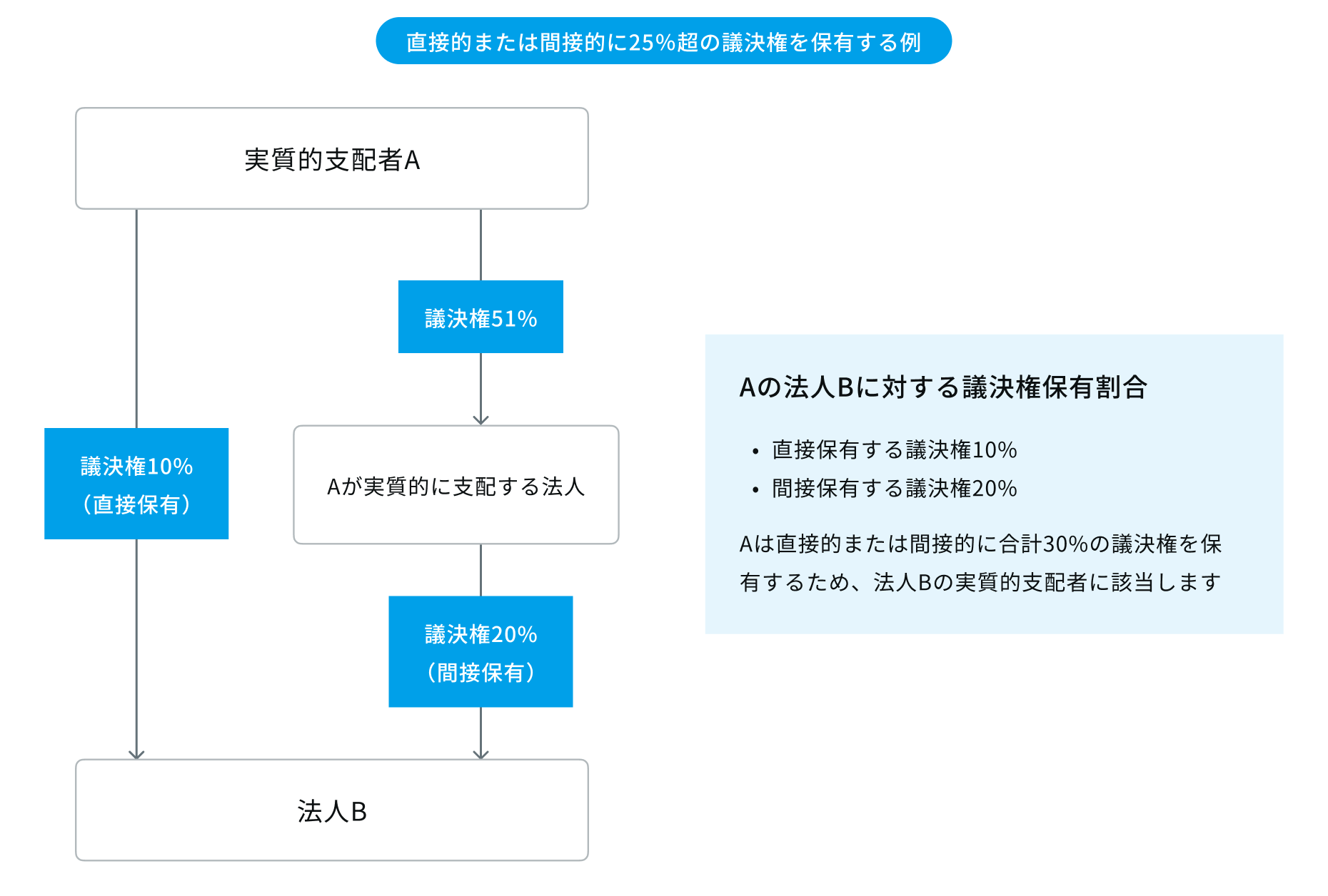 ※「間接保有」とは、個人が自らの支配する法人(50%超の議決権を保有する法人)を通じて、間接的に別の法人の議決権を保有することを指します。以下の例の場合、実質的支配者Aは直接的または間接的に25%以上の議決権を保有するため、法人Bの実質的支配者に該当します。